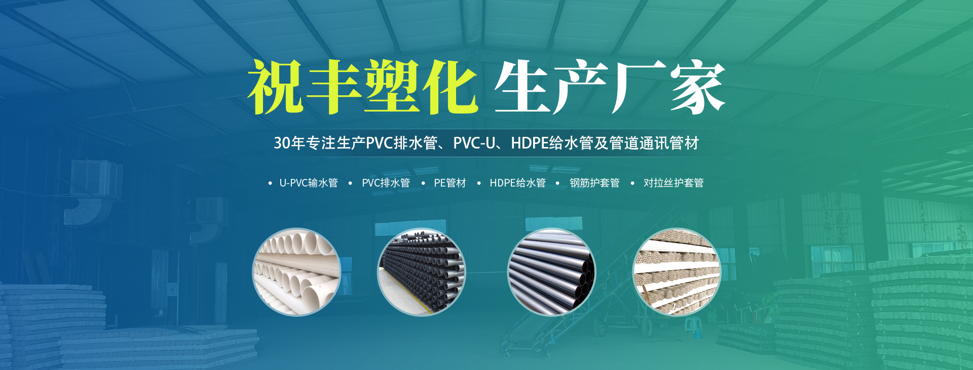 安陽市祝豐塑化有限公司坐落在滑縣工業(yè)園區(qū),東臨大廣高速,西臨京珠高速,是鄭州、鶴壁、安陽、濮陽四個(gè)城市的輸紐,交通便利、環(huán)境優(yōu)美。       公司始建于八十年代,經(jīng)過二十余年的艱辛創(chuàng)業(yè),規(guī)模不斷壯大,由十多萬元資產(chǎn)的小廠,發(fā)展到現(xiàn)占地面積達(dá)一萬多平,建筑面積一萬平,資產(chǎn)2000多萬元管材生產(chǎn)企業(yè)。公司生產(chǎn)PVC-U、PVC排水管、HDPE給水管、鋼筋護(hù)套管管道通訊管材等產(chǎn)品,廣泛用于農(nóng)田節(jié)水、高山引水、人畜用水、建筑、電力通訊等多種用途,品種齊全。為了滿足用戶需求,可承攬各種給水、節(jié)水、灌溉工程。“祝豐塑化”憑借強(qiáng)勁的實(shí)力,優(yōu)良的管理水平。“以質(zhì)量求生存,以信譽(yù)求發(fā)展”的原則全力以赴和大家共同塑造美好未來。..